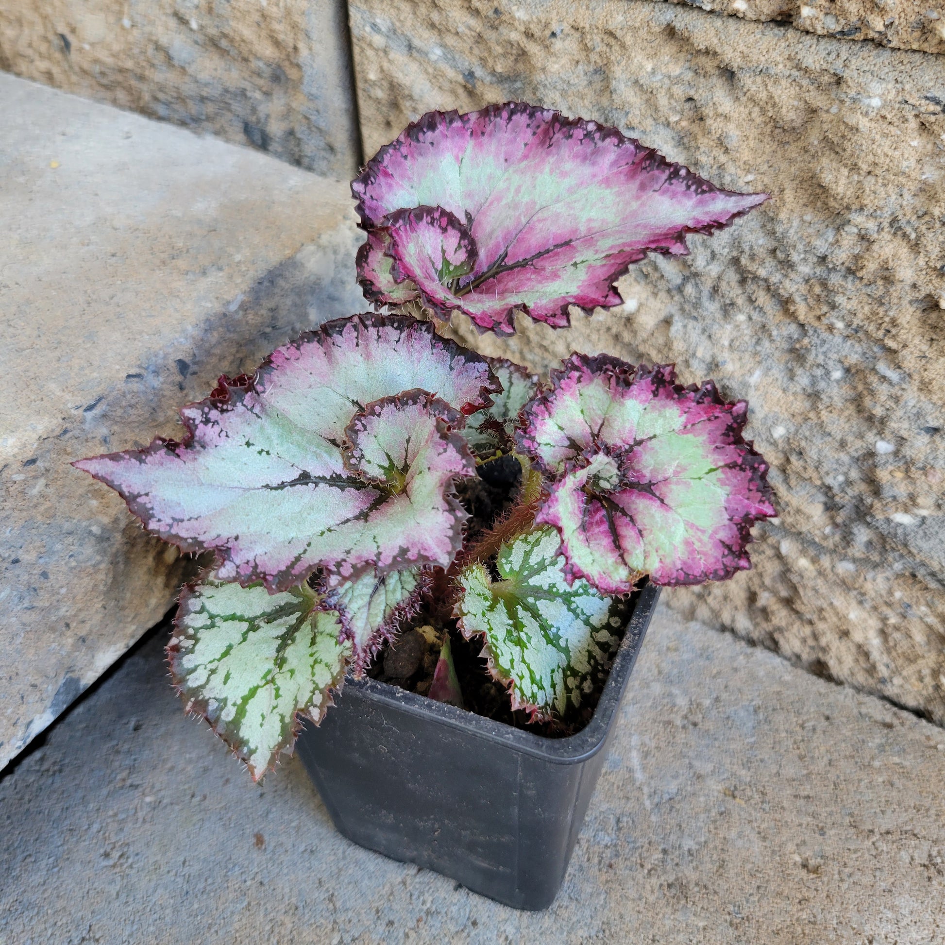 Begonia 'Purple Curl' is a rex variety with vibrant curled leaves with red, purple and silver colors.